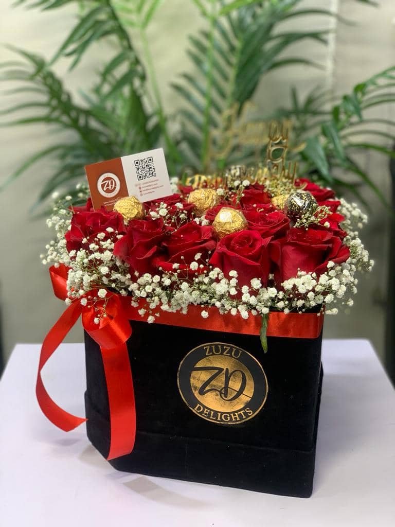 This carefully curated box combines the classic elegance of fresh flowers with the sweetness of gourmet chocolates, all arranged to perfection.